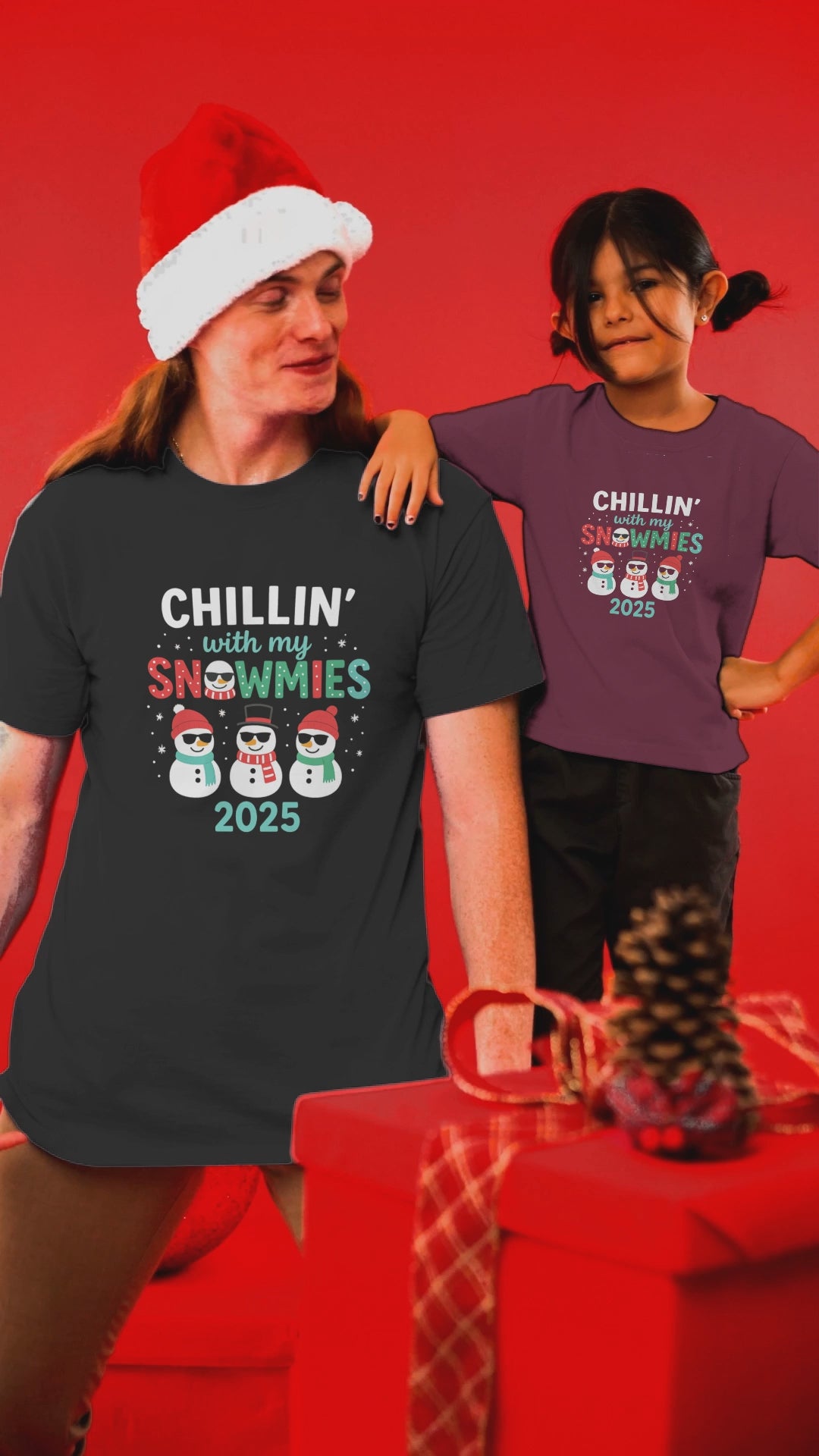 Embrace the cozy charm and lighthearted cheer of the season with this hilarious and comfortable Christmas T-shirt. The front features three cool, smiling snowmen rocking winter hats and stylish sunglasses, sitting beneath the popular phrase, “Chillin’ with my Snowmies 2025.”